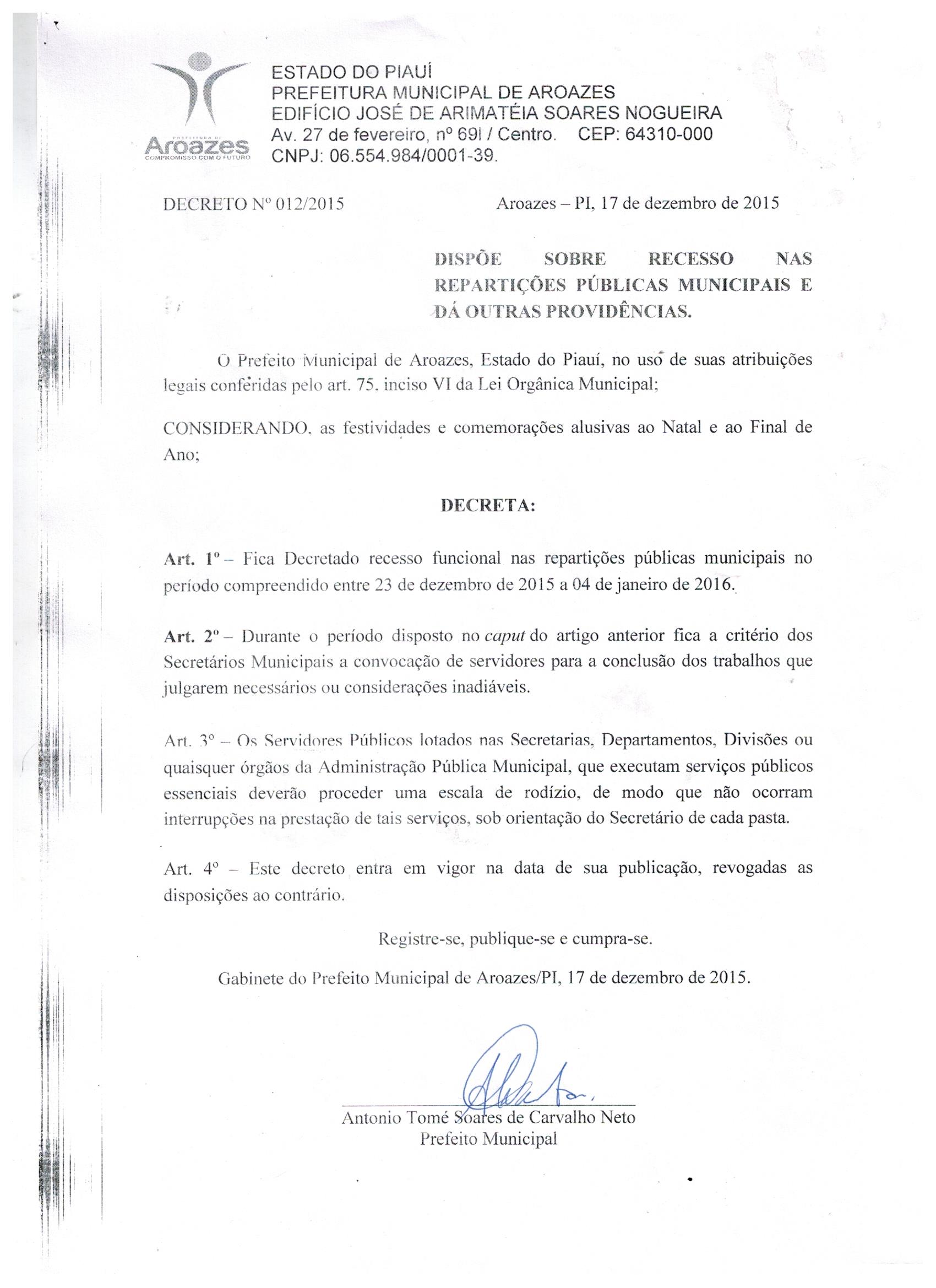 Lei publicada em 19 de Dezembro de 2022 35-2022Decreto Nº 35 - 2022 - Fica Decretado recesso funcional nas repartições públicas municipais |